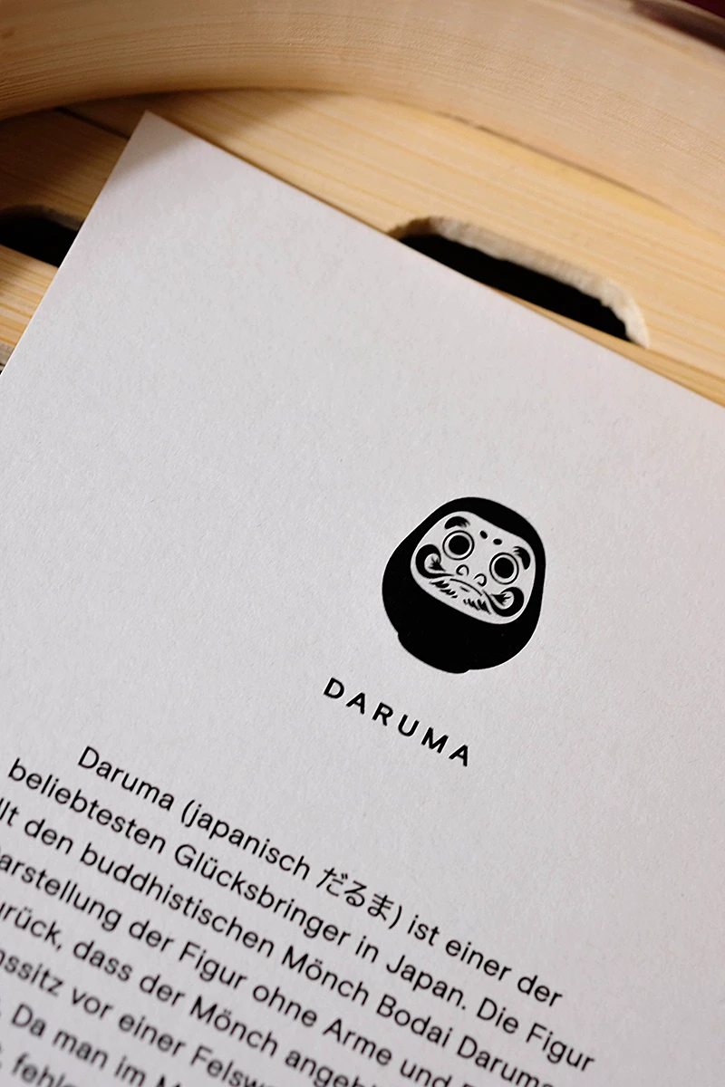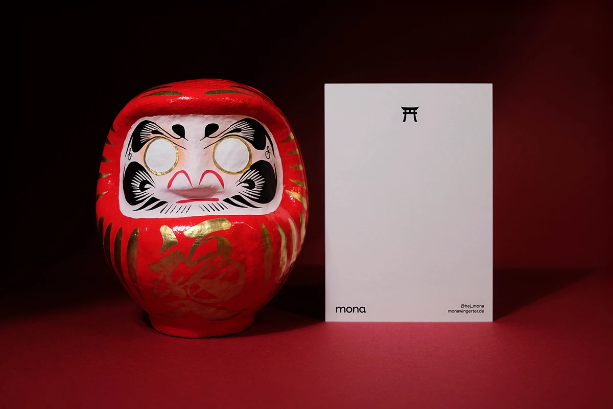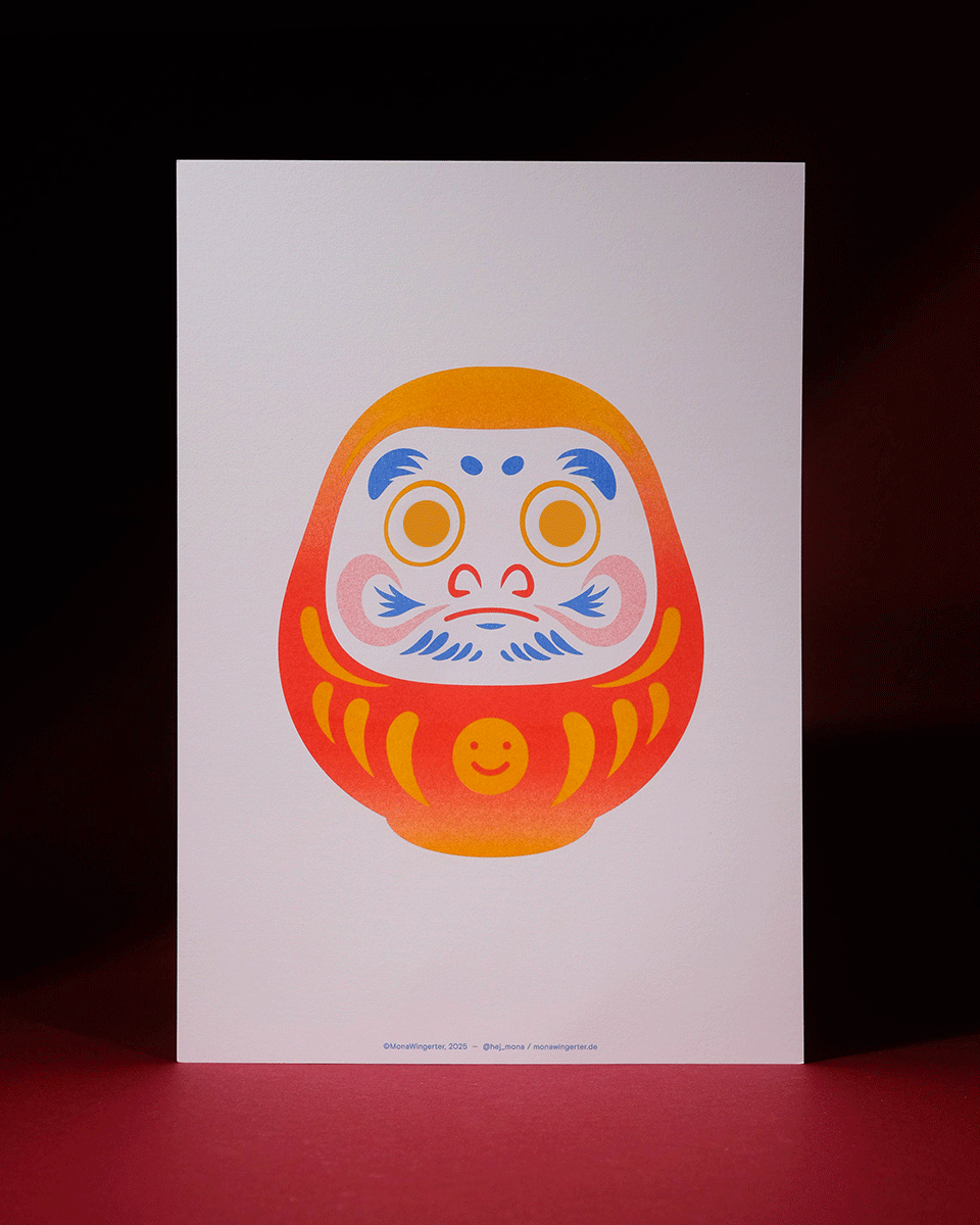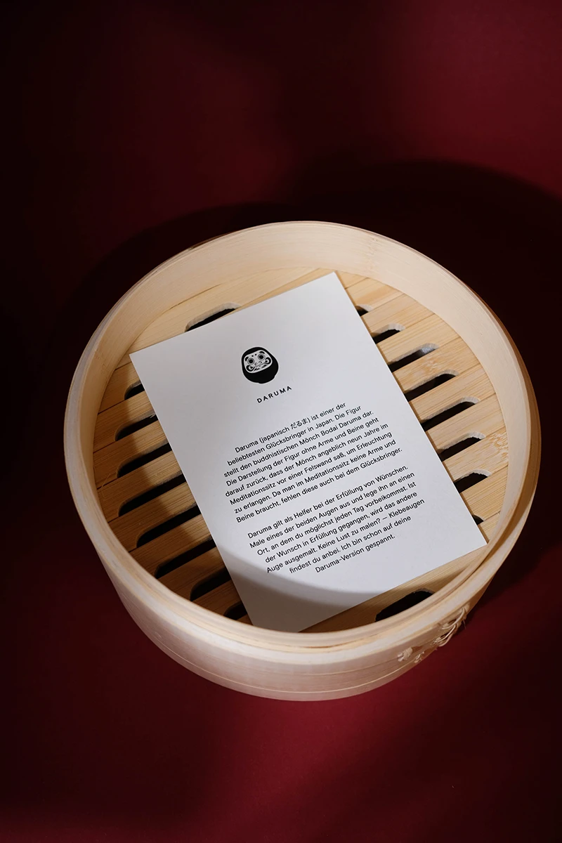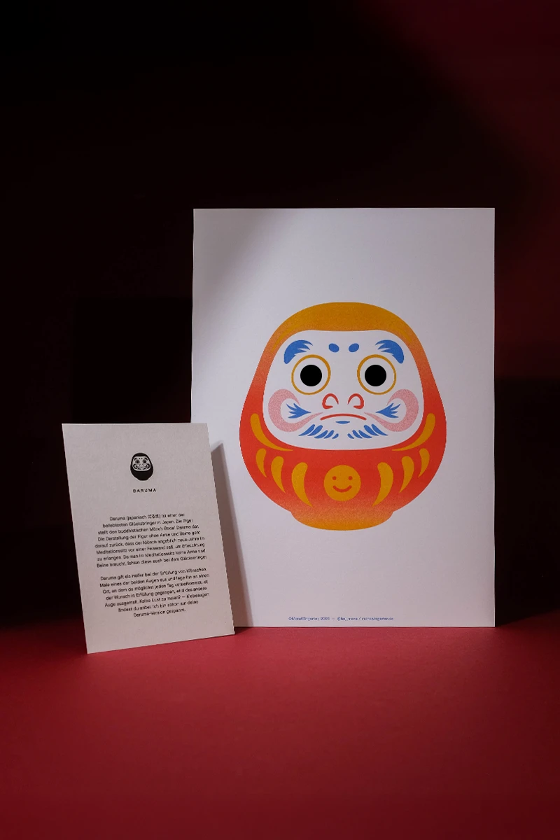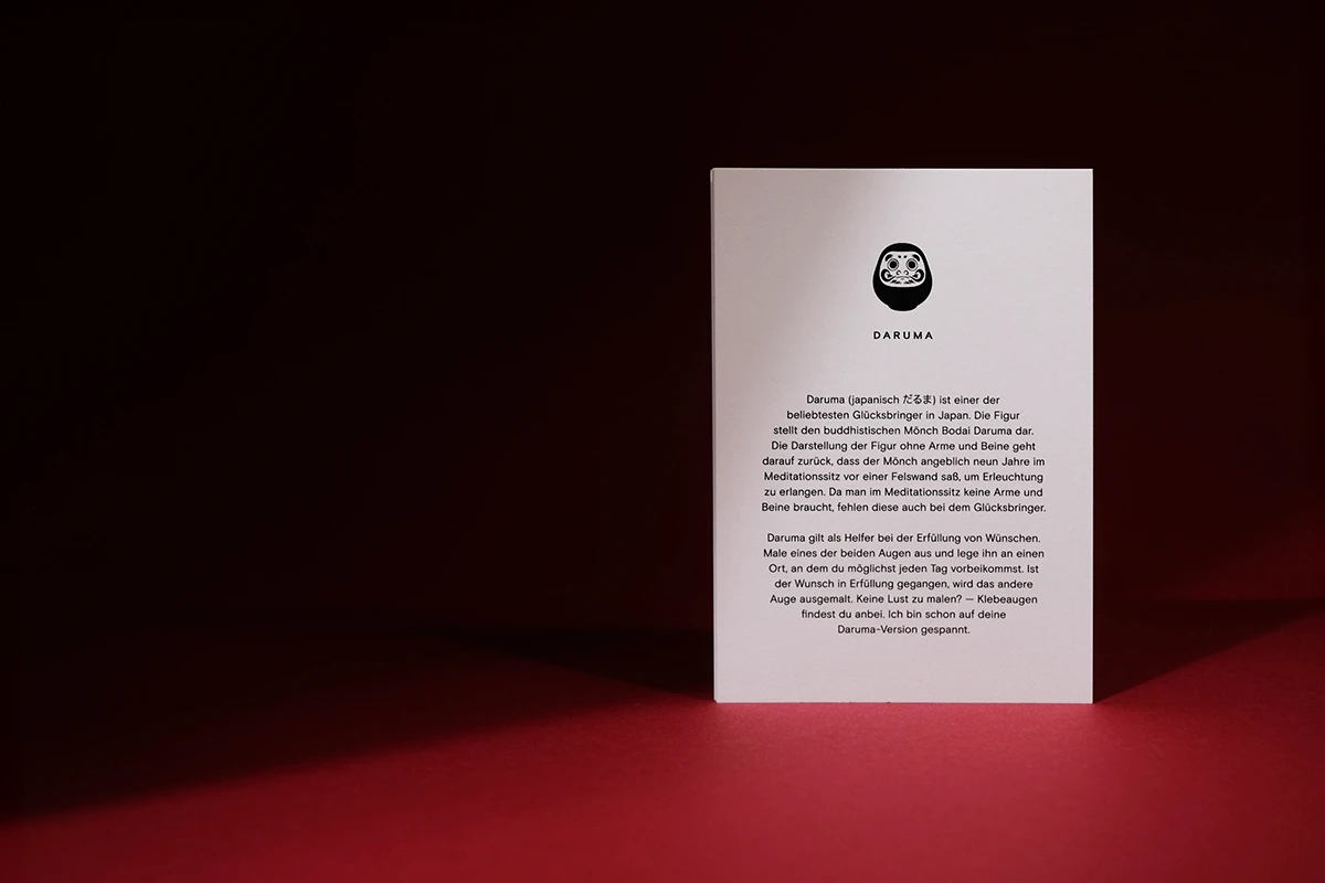 Das Weihnachtsmailing 2025 interpretiert die Ästhetik des japanischen Glücksbringers Daruma (japanisch だるま) in ein spielerisches Gestaltungskonzept. Die Figur stellt den buddhistischen Mönch Bodai Daruma dar. Die Darstellung der Figur ohne Arme und Beine geht darauf zurück, dass der Mönch neun Jahre im Meditationssitz vor einer Felswand saß, um Erleuchtung zu erlangen. Da man im Meditationssitz keine Arme und Beine braucht, fehlen diese auch bei dem Glücksbringer. Daruma gilt als Helfer bei der Erfüllung von Wünschen. Zuerst malt man eines der beiden Augen aus und legt ihn an einen Ort, an dem man möglichst jeden Tag vorbeikommt. Ist der Wunsch erfüllt, wird das zweite Auge ausgemalt. Um dieses Konzept auf dem Poster aufzugreifen, ist der Glücksbringer ohne Augen dargestellt. Zusätzlich erhalten die Empfänger runde Klebesticker, mit denen sie das Poster selbst vervollständigen können. Der Fokus liegt dabei auf den weichen Farbverläufen des besonderen Risoprints. Die frische Farbwahl verbindet traditionelle Gestaltung mit einem modernen Look. Ergänzt wird das Poster durch eine Karte, die die Bedeutung des Daruma erklärt. Auf der Rückseite setzt ein kleines Torii Gate einen symbolischen Akzent, denn es steht für den Übergang in positive, neue Lebensabschnitte. Das Mailing wird in rotes Seidenpapier eingeschlagen und mit einem metallischen Smiley-Sticker versiegelt. Der bewusste Verzicht auf klassische Weihnachtsmotive macht das Design zeitlos, sodass es unabhängig von der Jahreszeit genutzt werden kann. Die typischen Texturen und Verläufe des Risoprints machen jedes der 100 Exemplare zu einem Unikat. Nach Weihnachten dient das Set außerdem als ausgefallenes Papiermuster, das Kunden die Besonderheiten des Risoprints näherbringt. Gedruckt wurde das Poster im Risoprint bei „Herr & Frau Rio“ in München.