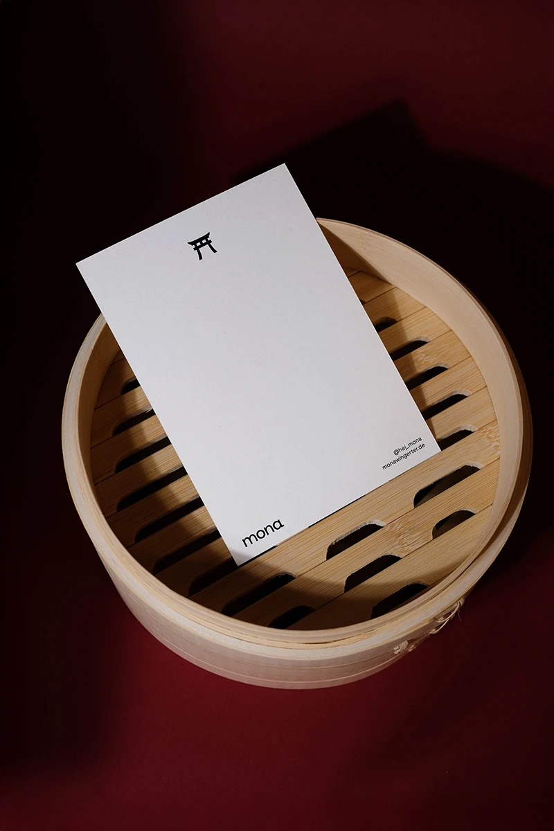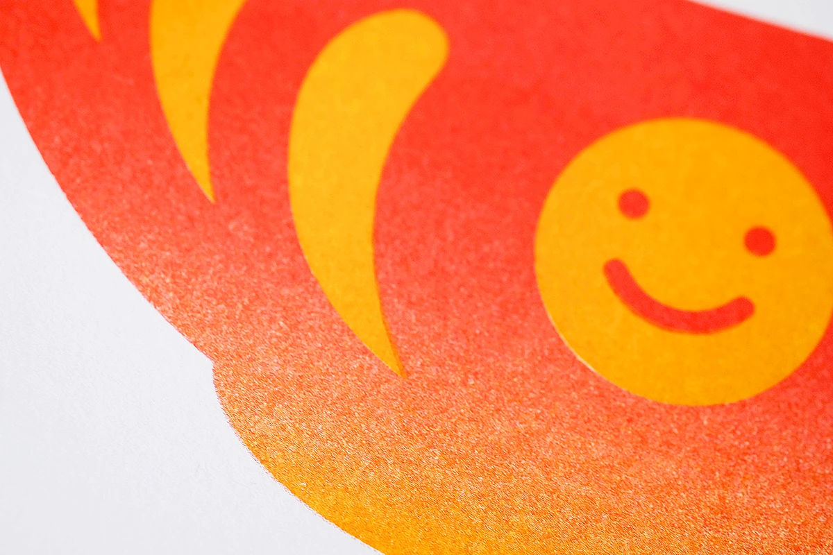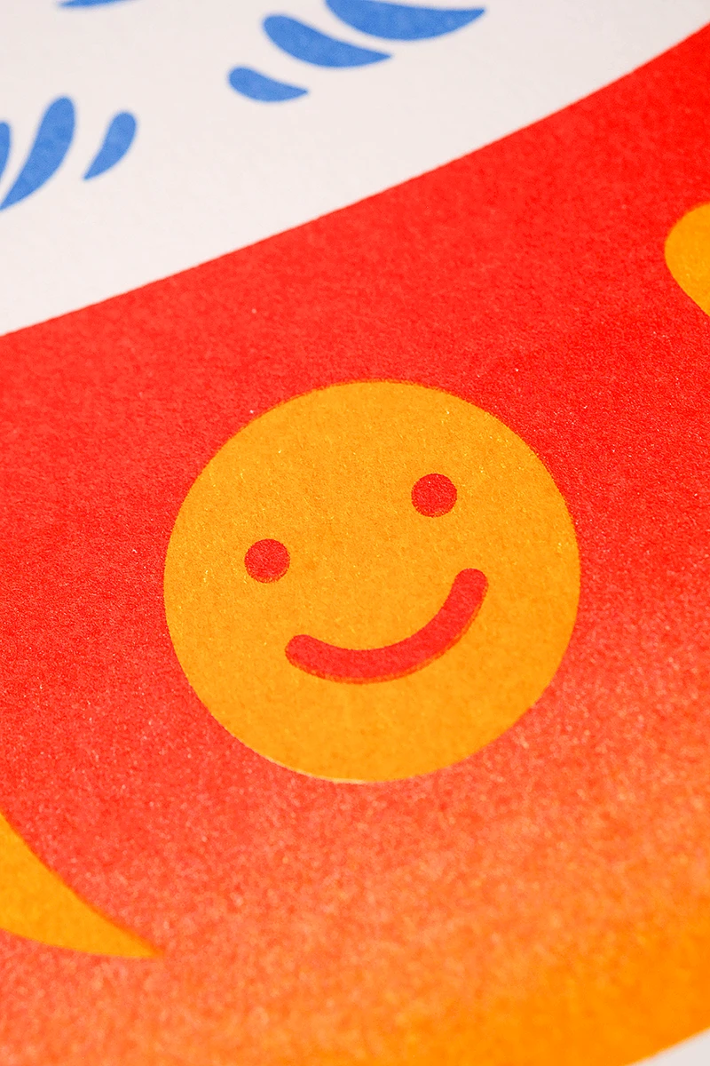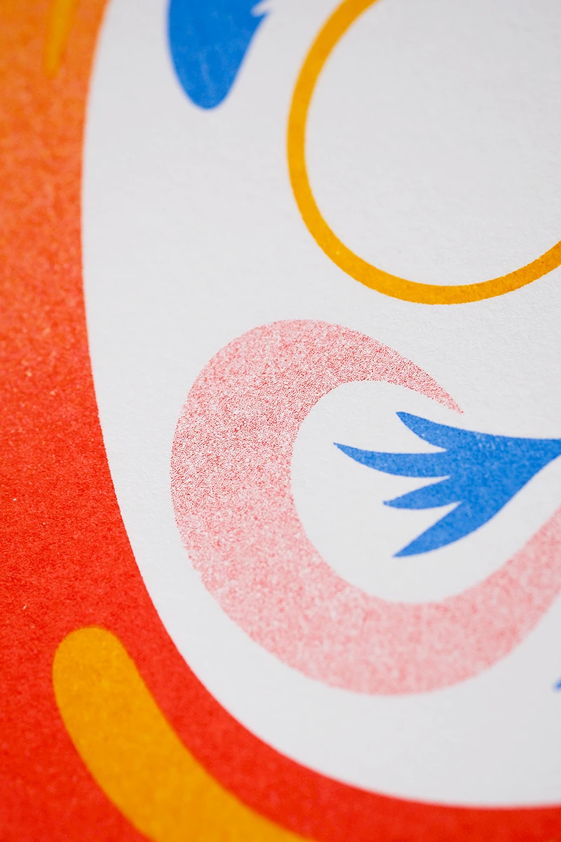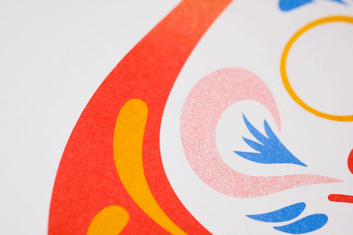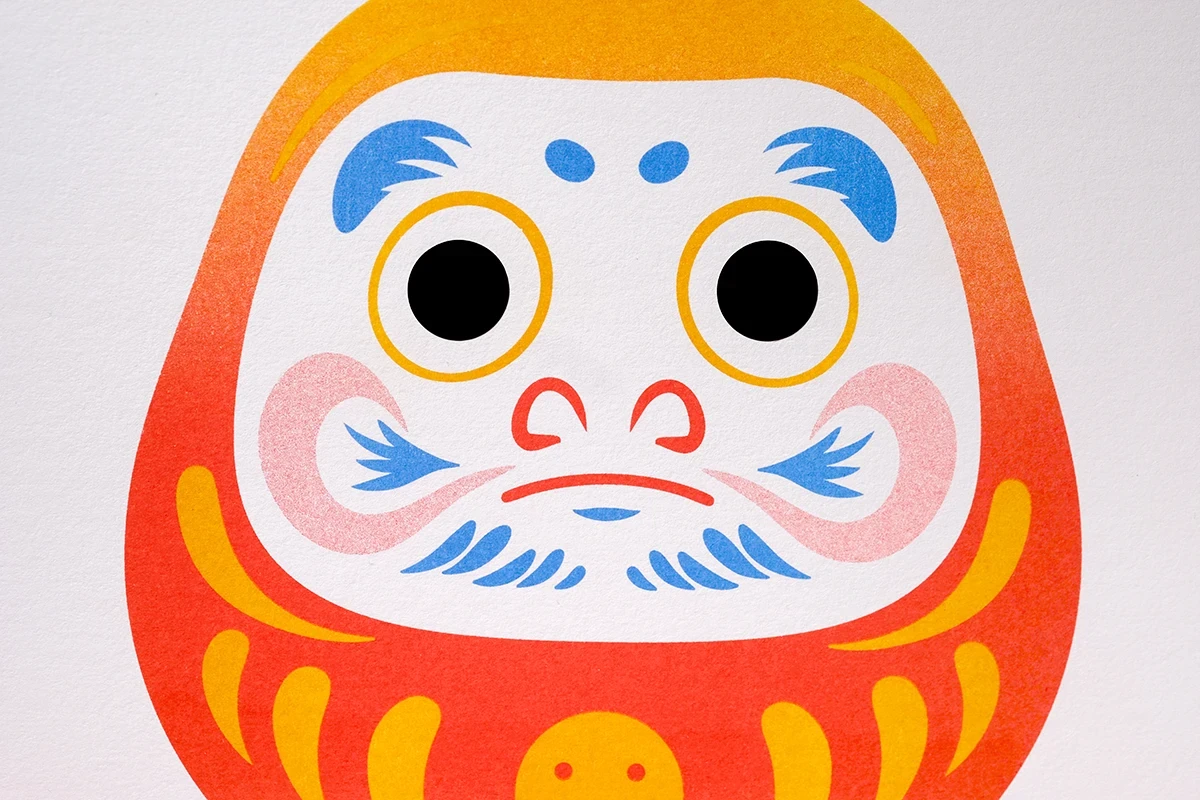 Das Weihnachtsmailing 2025 interpretiert die Ästhetik des japanischen Glücksbringers Daruma (japanisch だるま) in ein spielerisches Gestaltungskonzept. Die Figur stellt den buddhistischen Mönch Bodai Daruma dar. Die Darstellung der Figur ohne Arme und Beine geht darauf zurück, dass der Mönch neun Jahre im Meditationssitz vor einer Felswand saß, um Erleuchtung zu erlangen. Da man im Meditationssitz keine Arme und Beine braucht, fehlen diese auch bei dem Glücksbringer. Daruma gilt als Helfer bei der Erfüllung von Wünschen. Zuerst malt man eines der beiden Augen aus und legt ihn an einen Ort, an dem man möglichst jeden Tag vorbeikommt. Ist der Wunsch erfüllt, wird das zweite Auge ausgemalt. Um dieses Konzept auf dem Poster aufzugreifen, ist der Glücksbringer ohne Augen dargestellt. Zusätzlich erhalten die Empfänger runde Klebesticker, mit denen sie das Poster selbst vervollständigen können. Der Fokus liegt dabei auf den weichen Farbverläufen des besonderen Risoprints. Die frische Farbwahl verbindet traditionelle Gestaltung mit einem modernen Look. Ergänzt wird das Poster durch eine Karte, die die Bedeutung des Daruma erklärt. Auf der Rückseite setzt ein kleines Torii Gate einen symbolischen Akzent, denn es steht für den Übergang in positive, neue Lebensabschnitte. Das Mailing wird in rotes Seidenpapier eingeschlagen und mit einem metallischen Smiley-Sticker versiegelt. Der bewusste Verzicht auf klassische Weihnachtsmotive macht das Design zeitlos, sodass es unabhängig von der Jahreszeit genutzt werden kann. Die typischen Texturen und Verläufe des Risoprints machen jedes der 100 Exemplare zu einem Unikat. Nach Weihnachten dient das Set außerdem als ausgefallenes Papiermuster, das Kunden die Besonderheiten des Risoprints näherbringt. Gedruckt wurde das Poster im Risoprint bei „Herr & Frau Rio“ in München.