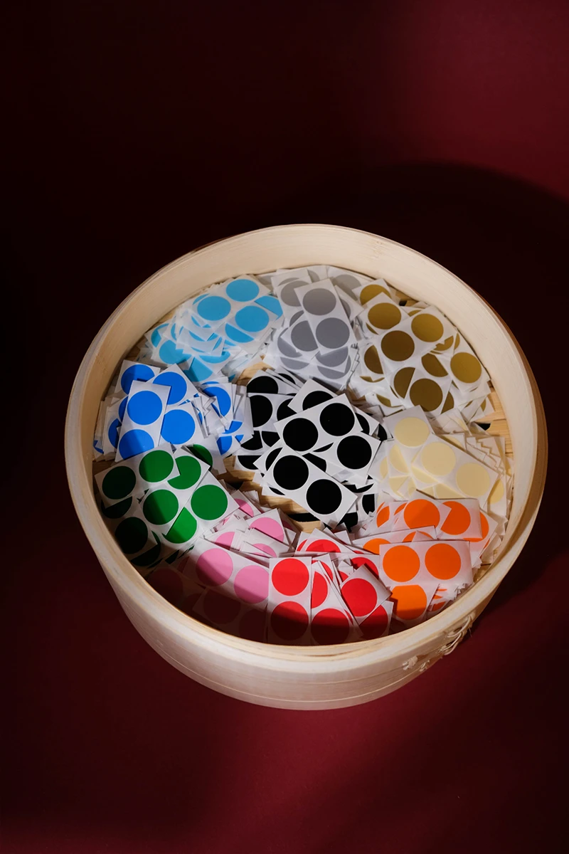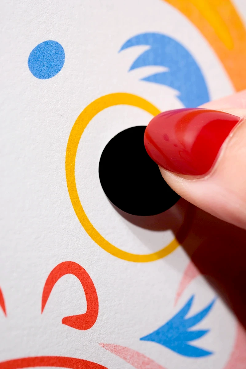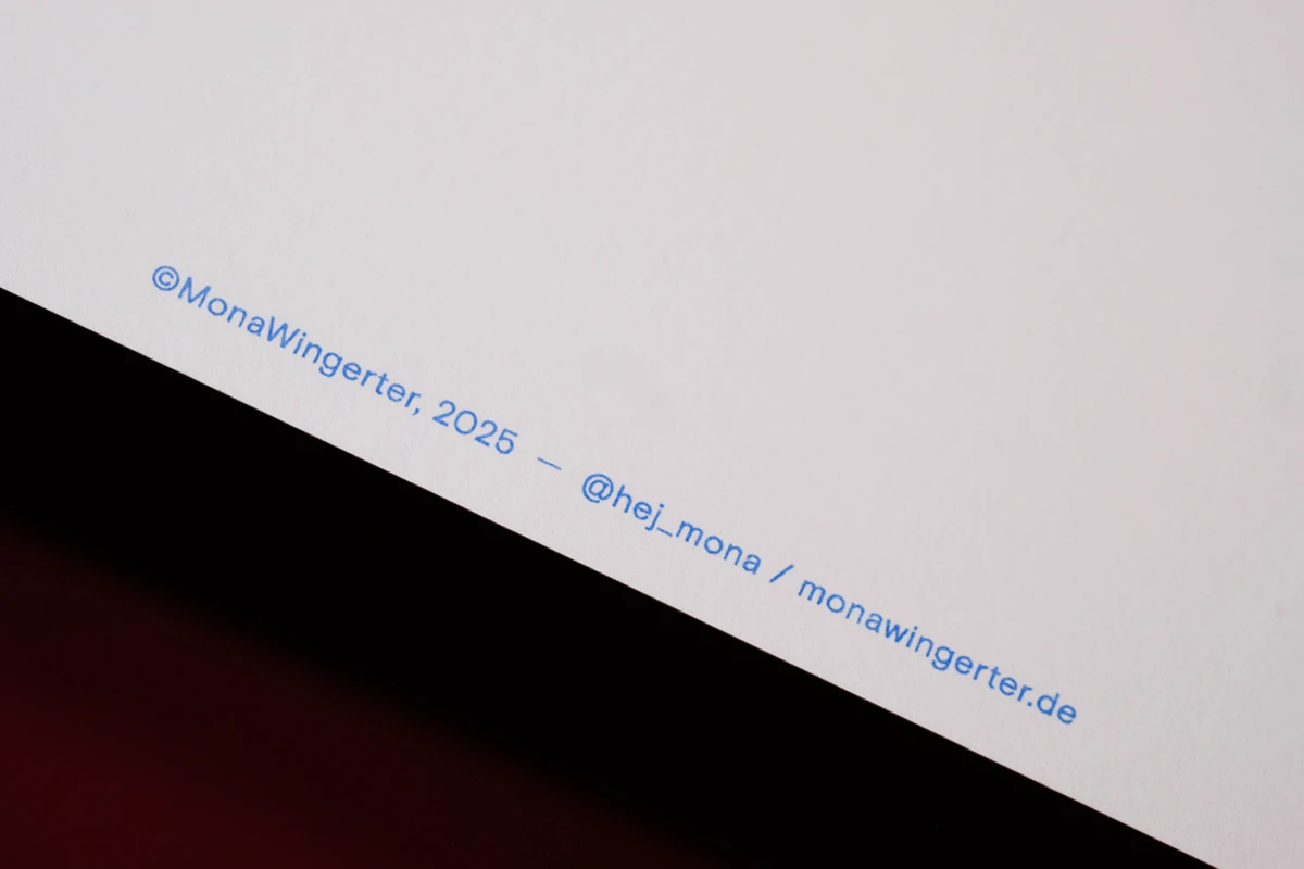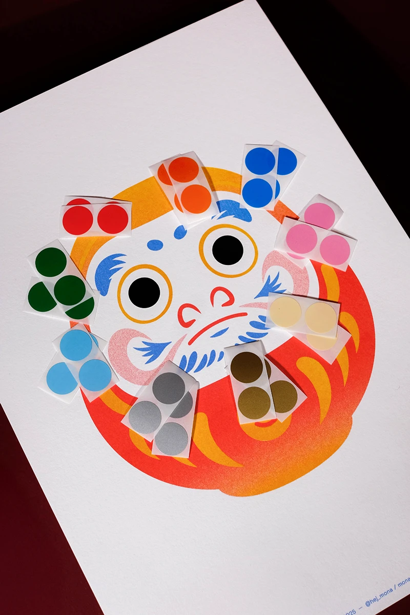 Das Weihnachtsmailing 2025 interpretiert die Ästhetik des japanischen Glücksbringers Daruma (japanisch だるま) in ein spielerisches Gestaltungskonzept. Die Figur stellt den buddhistischen Mönch Bodai Daruma dar. Erst malt man eins der beiden Augen aus, ist der Wunsch in Erfüllung gegangen, wird das andere Auge ausgemalt. Um das Konzept auf dem Poster aufzugreifen, ist der Glücksbringer ohne Augen abgebildet. Die Empfänger erhalten runde Klebesticker für die Augen um das Poster zu vervollständigen. Der Hauptfokus bei der Gestaltung liegt in den Verläufen des speziellen Druckverfahrens und der modernen Farbwahl die ein Mix aus traditionellem Design und moderner interaktiver Kunst schafft. Ergänzt wird das Poster von einer Karte, die die Bedeutung des Daruma erläutert. Das Mailing wird in rotes Seidenpapier eingeschlagen und mit einem metallischen Smiley-Sticker versiegelt. Die entstandenen Texturen und Verläufe, die durch den Risoprint entstehen, machen jedes der 100 Exemplare zu einem Unikat.