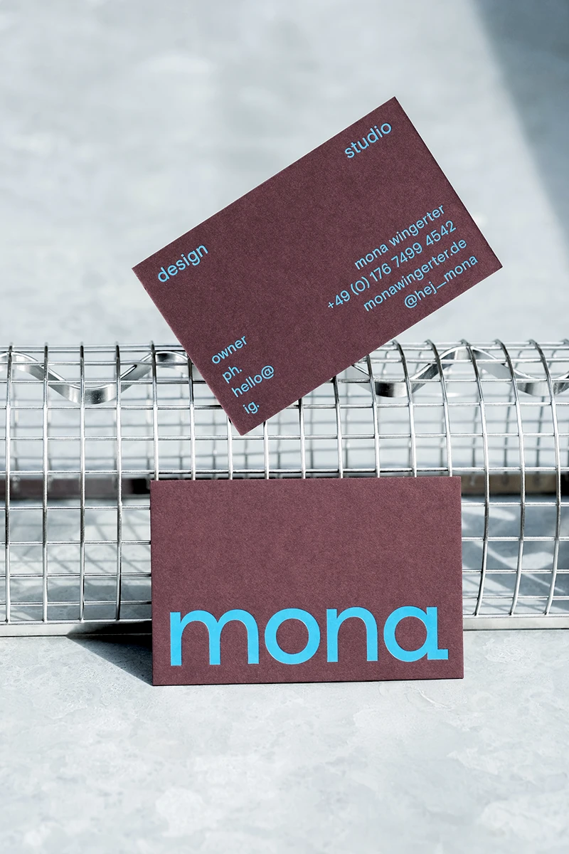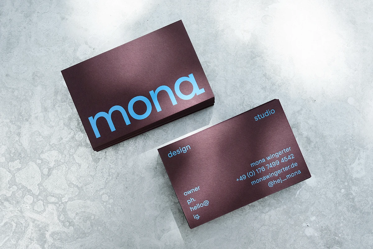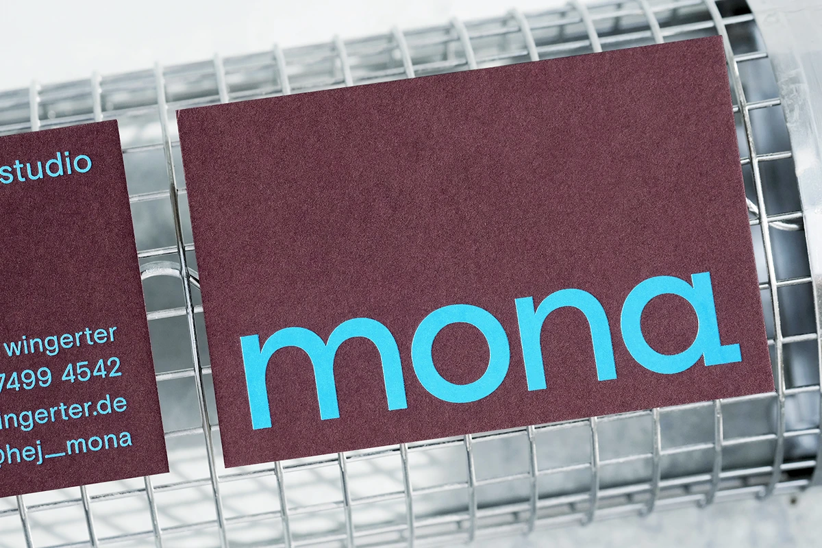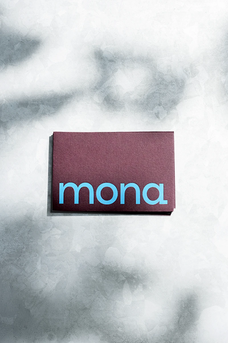 Für das Design Studio mona wurde ein neues visuelles Erscheinungsbild entwickelt, das die klare, moderne Haltung des Studios unterstreicht. Das Logo präsentiert sich clean und bold in einer reduzierten, geometrischen Typografie, ohne sich in den Vordergrund zu drängen. Es fügt sich harmonisch in das Gesamtbild der Markenkommunikation ein und lässt den Projekten auf der Website weiterhin Raum zur Entfaltung, ein ausgeglichener Mix zwischen Marke und Inhalt. Die neue Visitenkarte übersetzt den klaren Markenauftritt in Farbe, Typografie und Haptik: ein dunkelrotes Feinstpapier in Kombination mit einer hellblauen Folienprägung. Das Zusammenspiel aus matter Oberfläche und glänzender Akzentfarbe schafft einen hochwertigen Kontrast, der die Karte mit der geometrischen Typografie zum Blickfang macht.